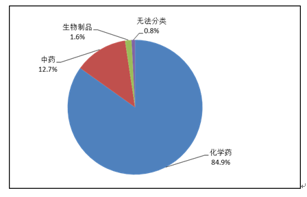 按照藥品類別統(tǒng)計(jì),化學(xué)藥品占86.6%,中藥占12.6%,生物制品占0.8%?;瘜W(xué)藥品排名居前的藥品類別是抗感染藥、心血管系統(tǒng)用藥、腫瘤用藥、神經(jīng)系統(tǒng)用藥、電解質(zhì)、酸堿平衡及營養(yǎng)藥;中藥排名居前的藥品類別是理血?jiǎng)⒀a(bǔ)益劑、祛濕劑、開竅劑、清熱劑。